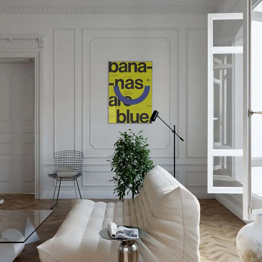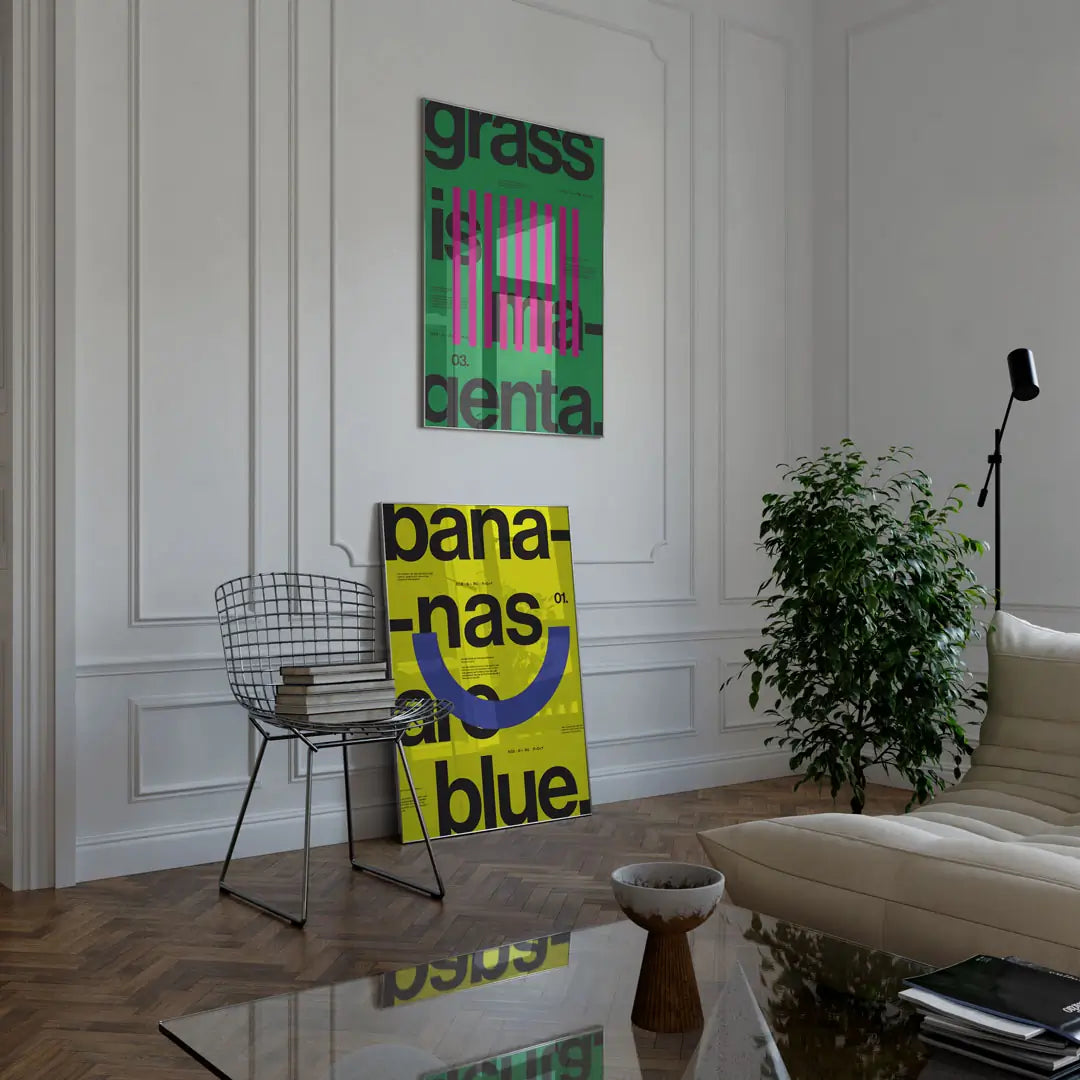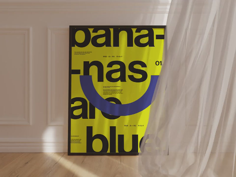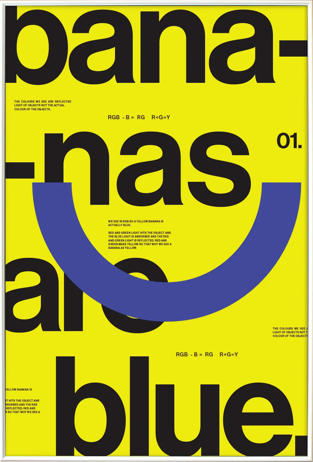 色彩の見え方に関する面白い科学的テーマを取り入れたアートピース第1弾。目を引く鮮やかなデザインが特徴の “1.Bananas " ポスターは、視覚的インパクトと色彩理論をテーマにしたユニークなアートピース。黄色をベースに、大胆な黒のタイポグラフィが配置され、青い半円形が加わることで、抽象的でモダンな印象に仕上がっています。