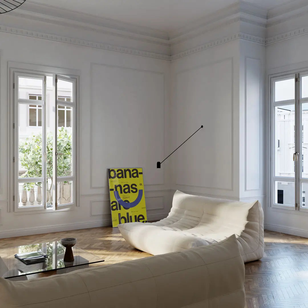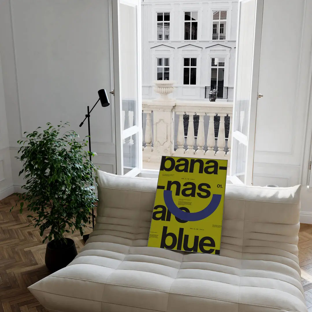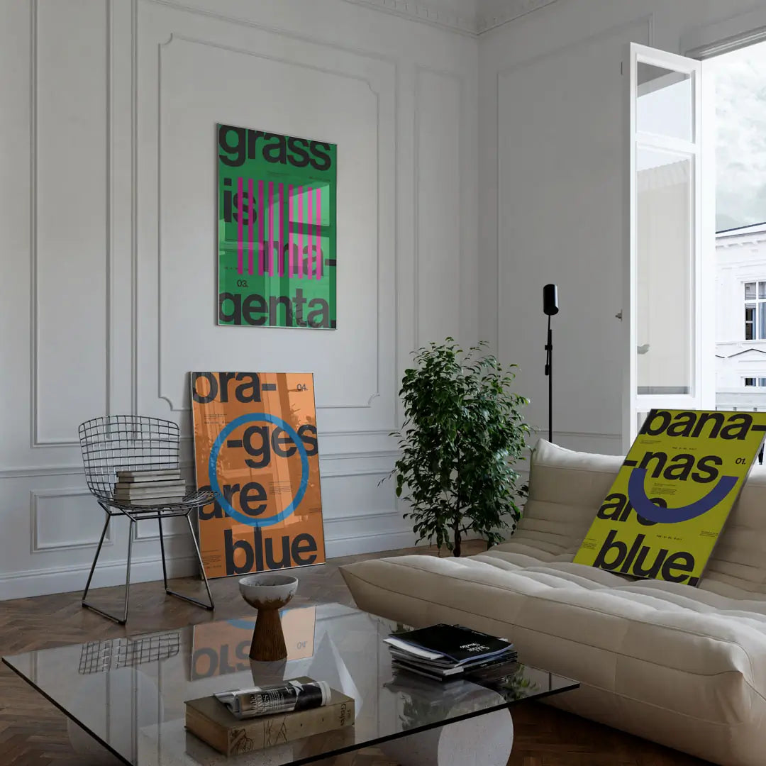 色彩の見え方に関する面白い科学的テーマを取り入れたアートピース第1弾。目を引く鮮やかなデザインが特徴の “1.Bananas " ポスターは、視覚的インパクトと色彩理論をテーマにしたユニークなアートピース。黄色をベースに、大胆な黒のタイポグラフィが配置され、青い半円形が加わることで、抽象的でモダンな印象に仕上がっています。