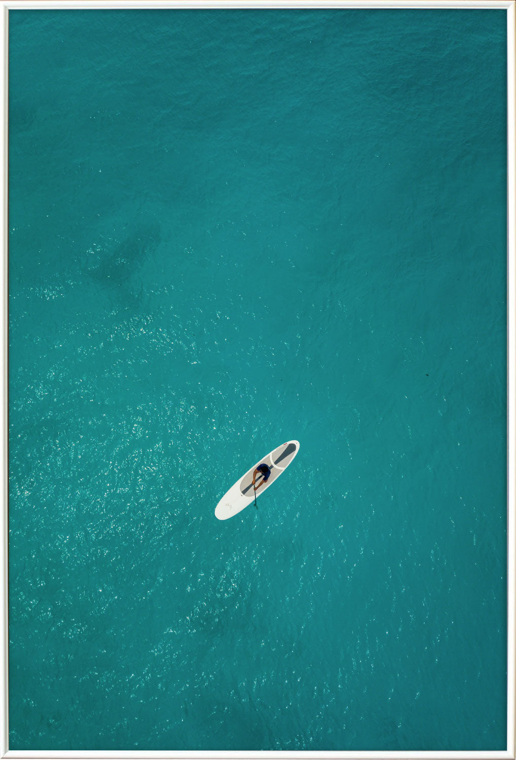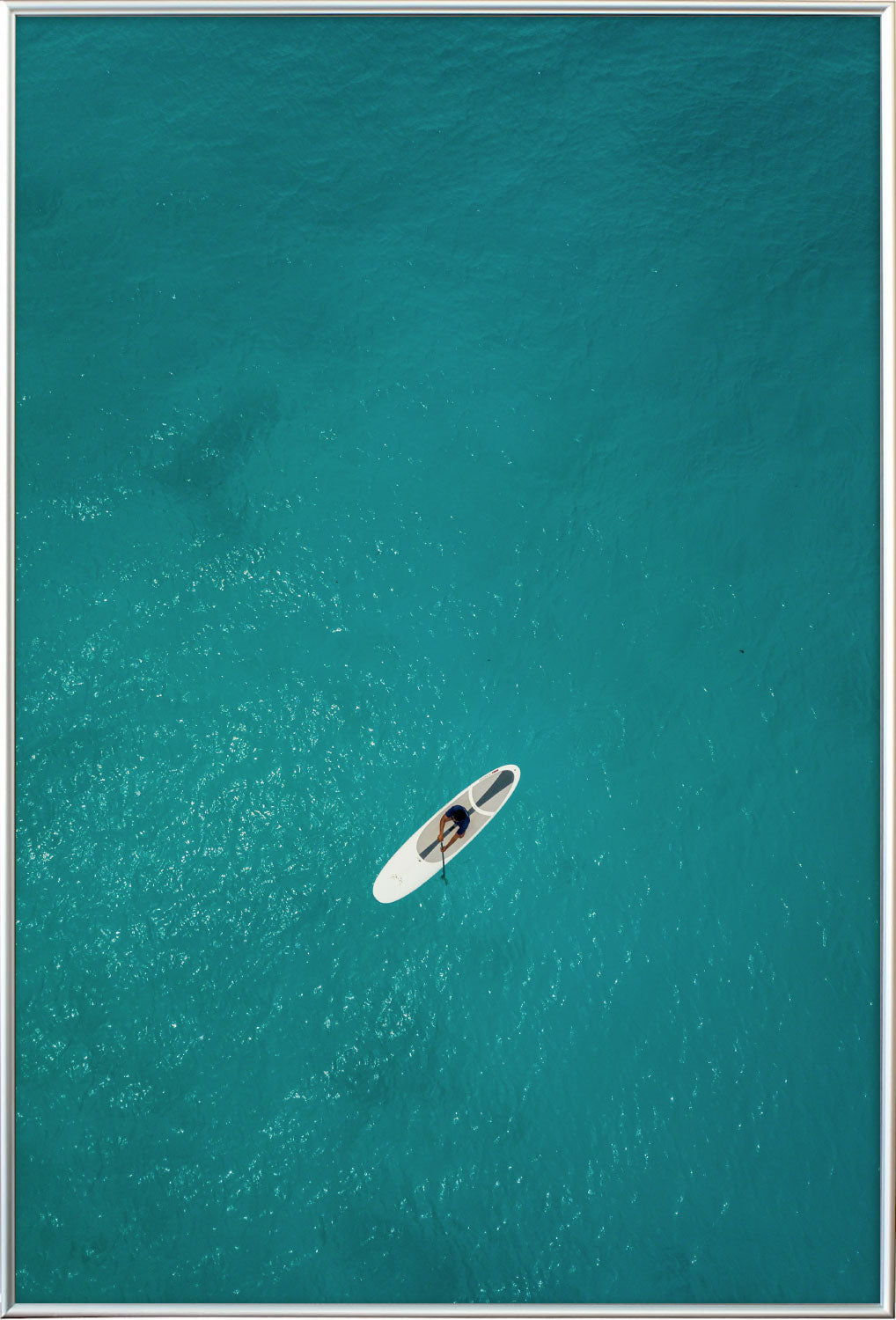 広大なターコイズブルーの海に、一艘のSUPと人影。