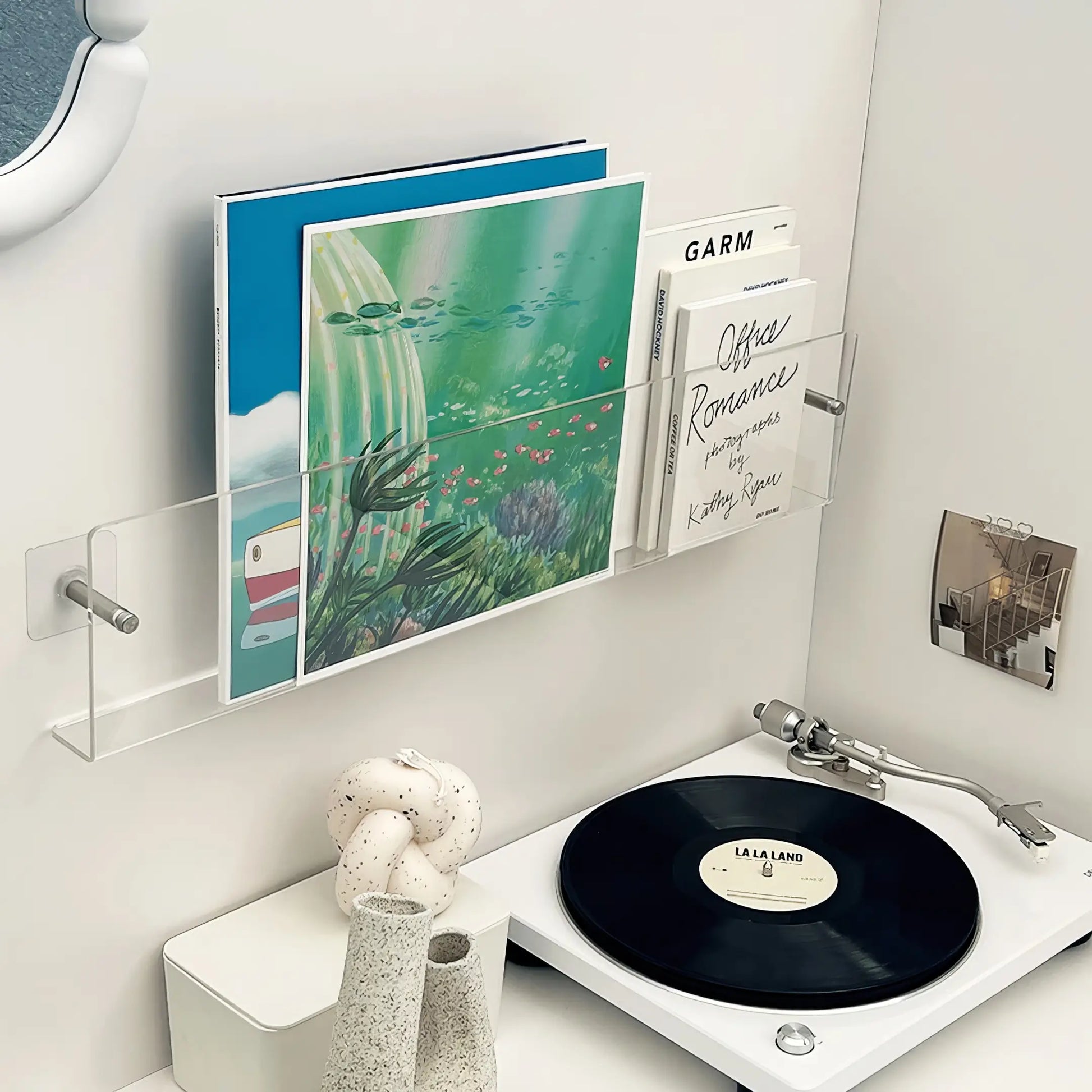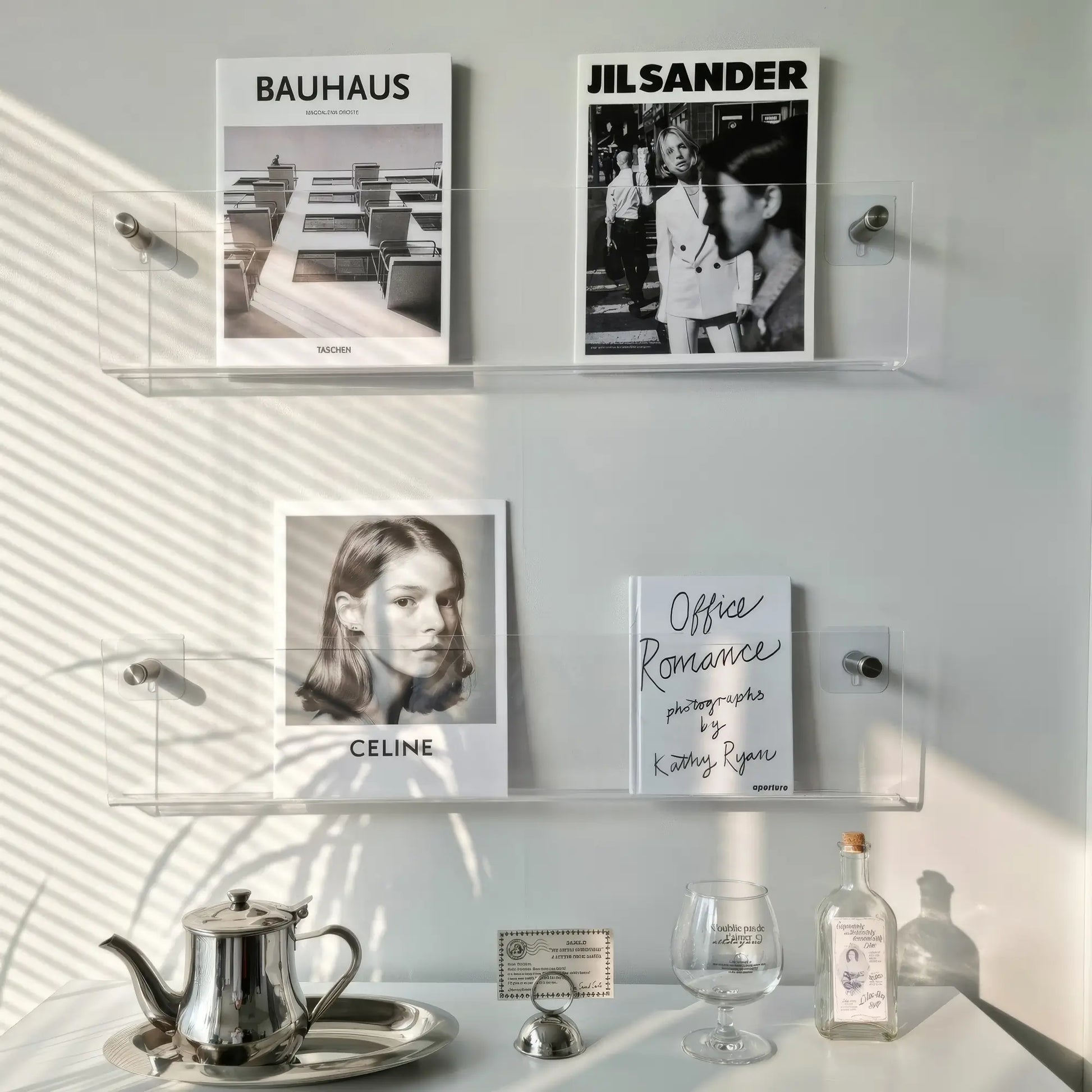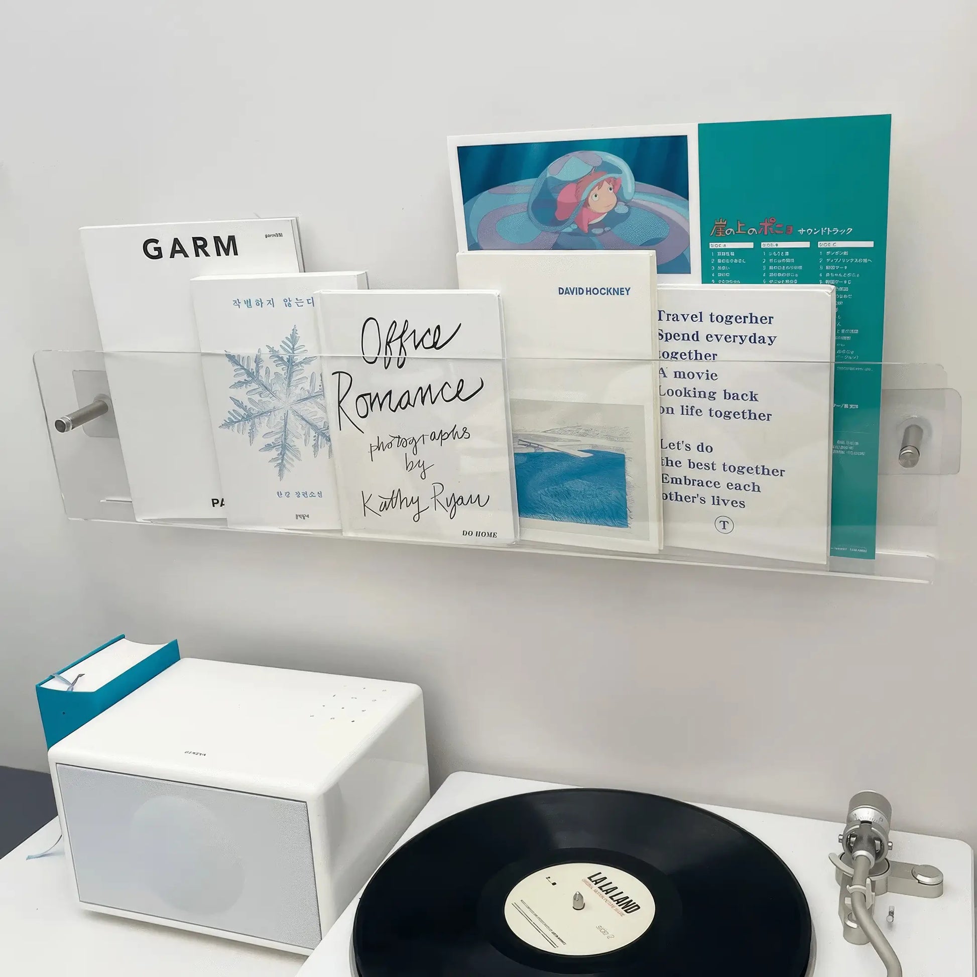 透明感溢れるアクリル素材とステンレス棚受けを使用し、お気に入りの雑誌やレコードをおしゃれに魅せる収納を叶えます。