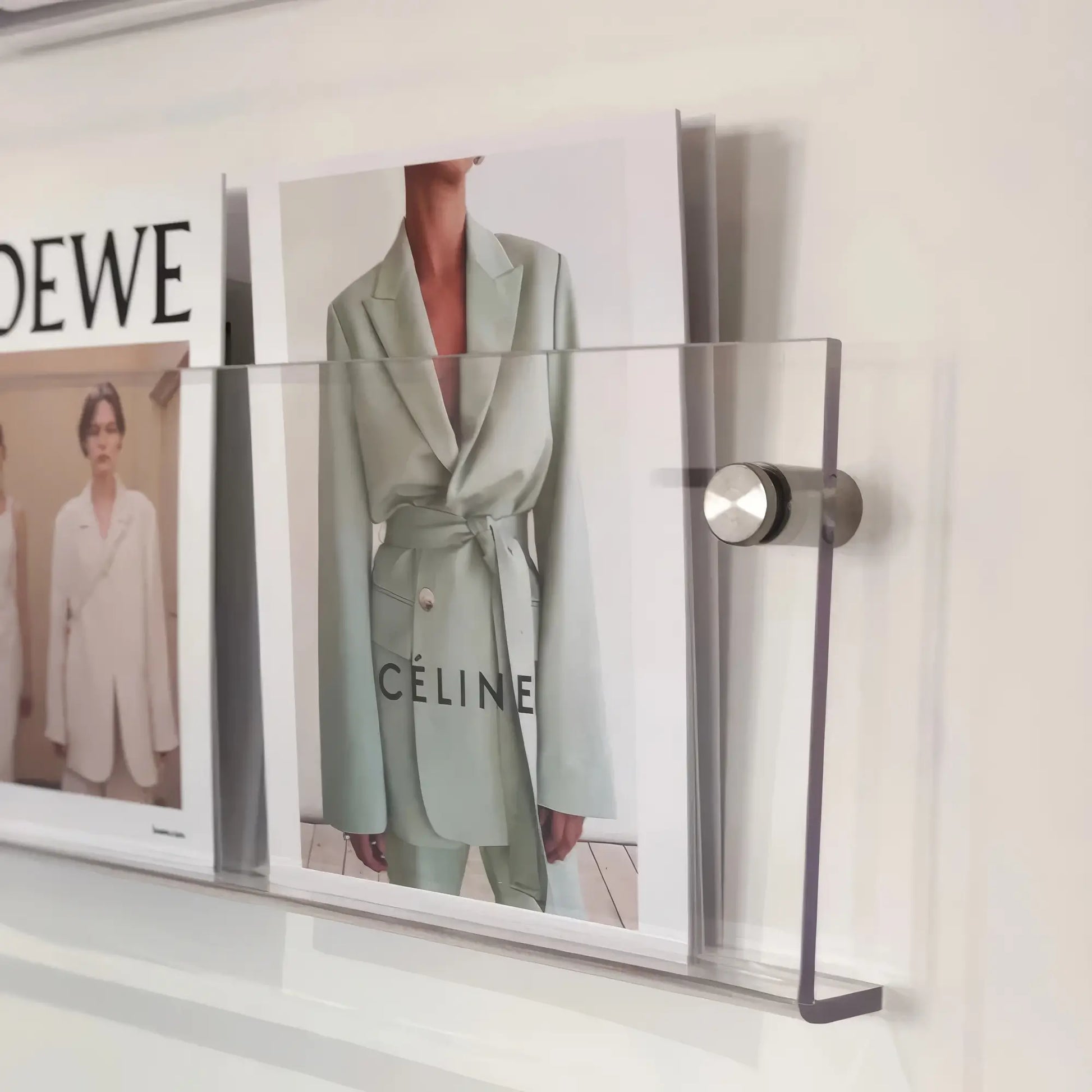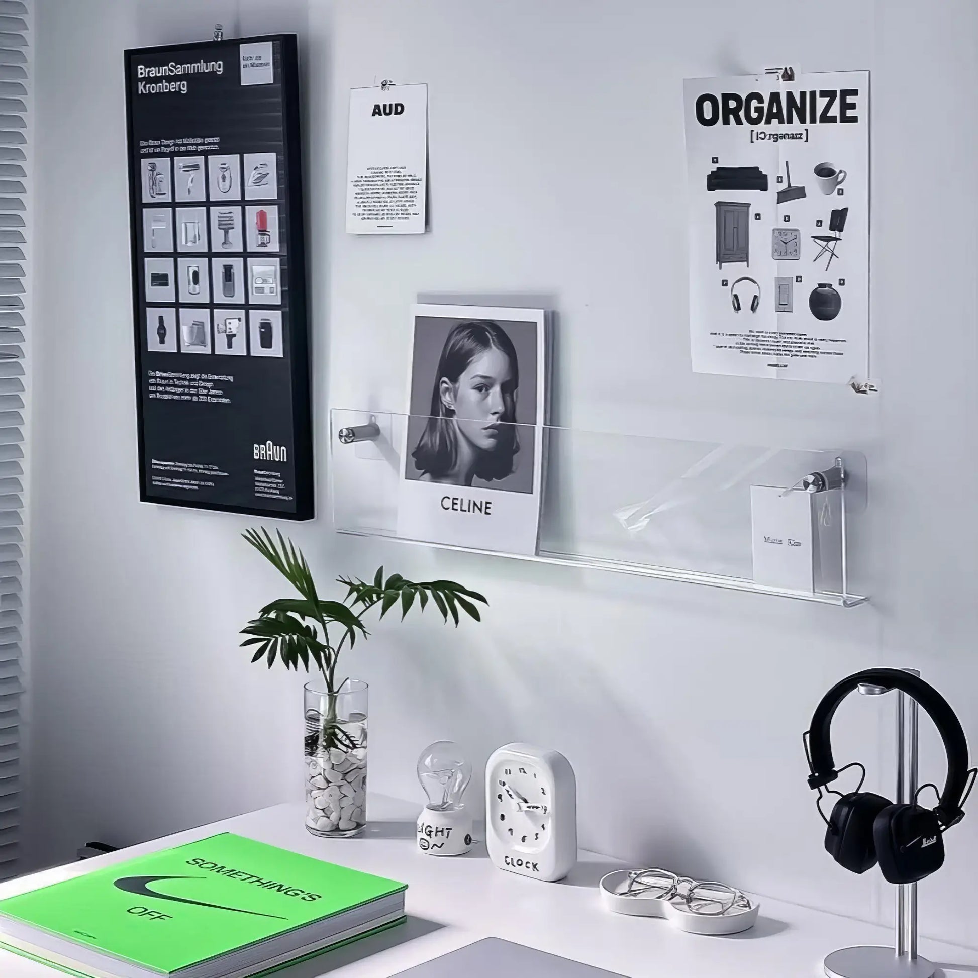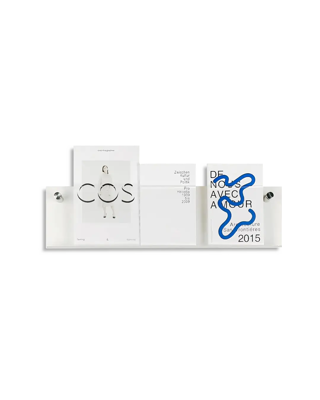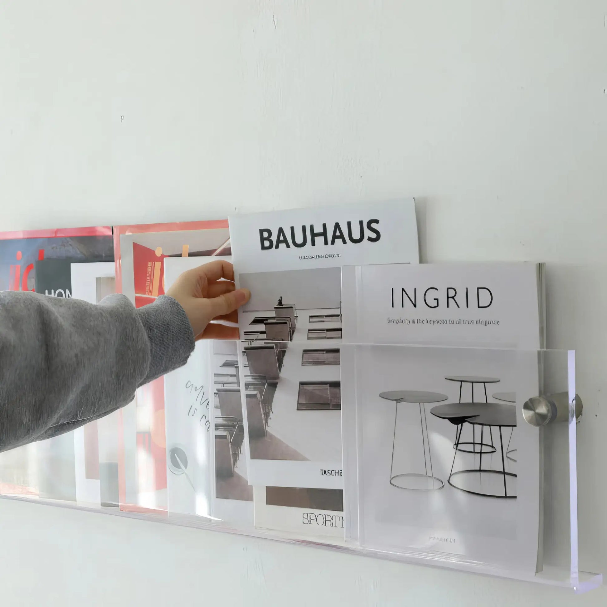 透明感溢れるアクリル素材とステンレス棚受けを使用し、お気に入りの雑誌やレコードをおしゃれに魅せる収納を叶えます。