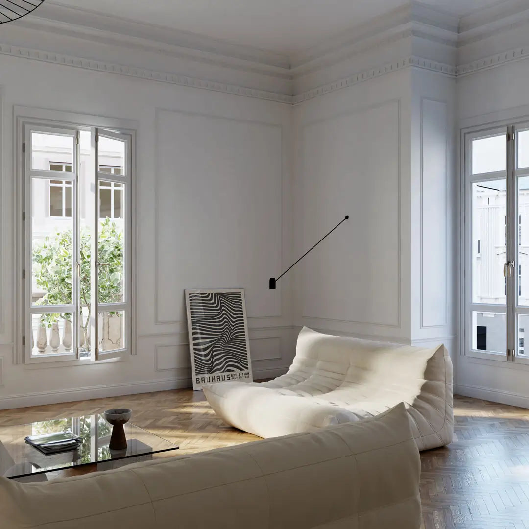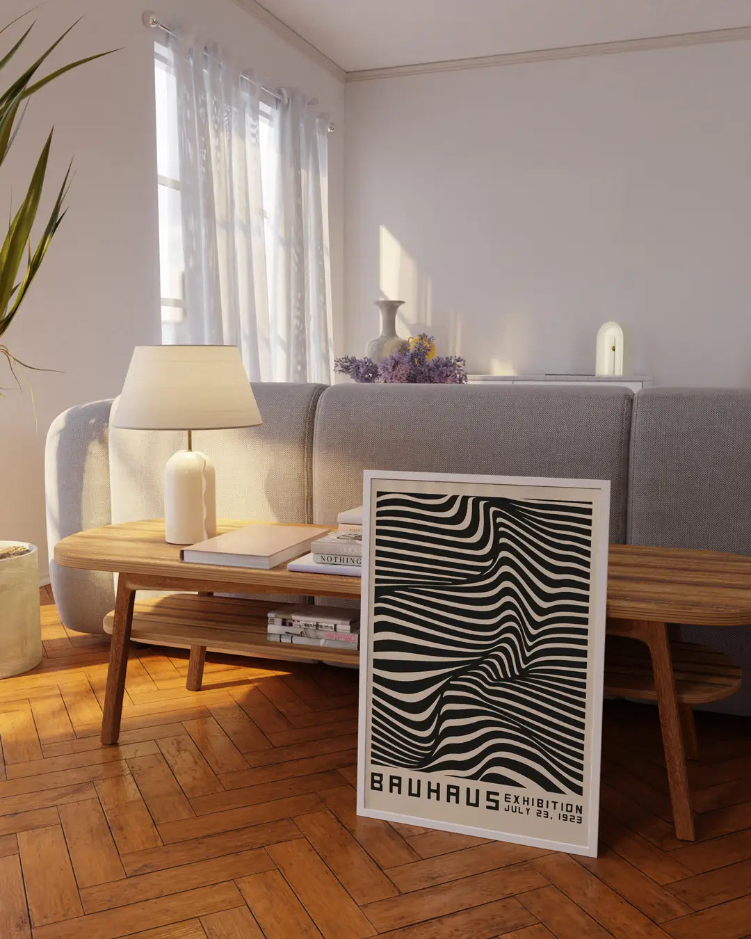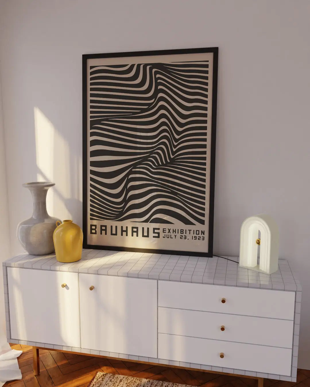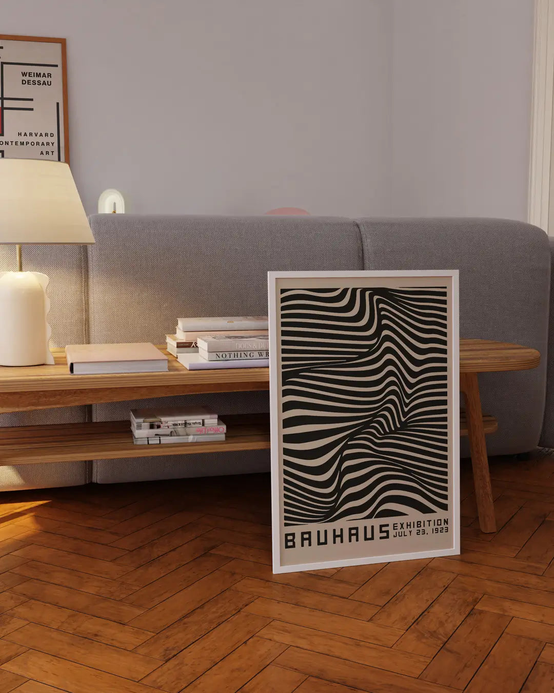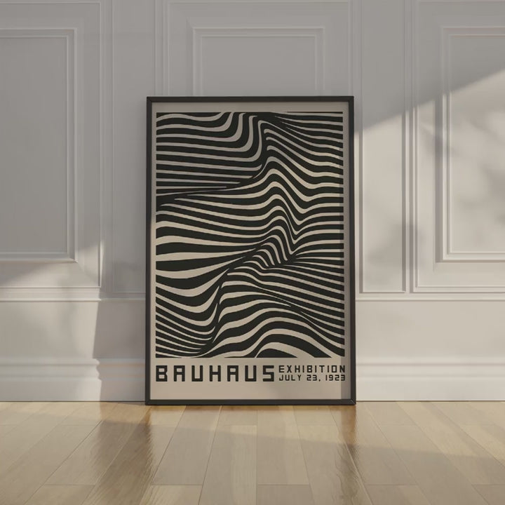 1923年に開催されたバウハウスの展覧会にインスパイアされたこのデザインは、バウハウスのミニマリズムの哲学と、大胆で流れるような幾何学的なラインが融合し、動きのある錯覚を生み出します。ブラックとベージュのカラーパレットが、このポスターの時代を超越した魅力を引き立て、モダン、インダストリアル、ミニマルなインテリアにぴったりです。