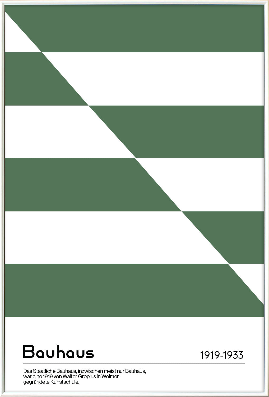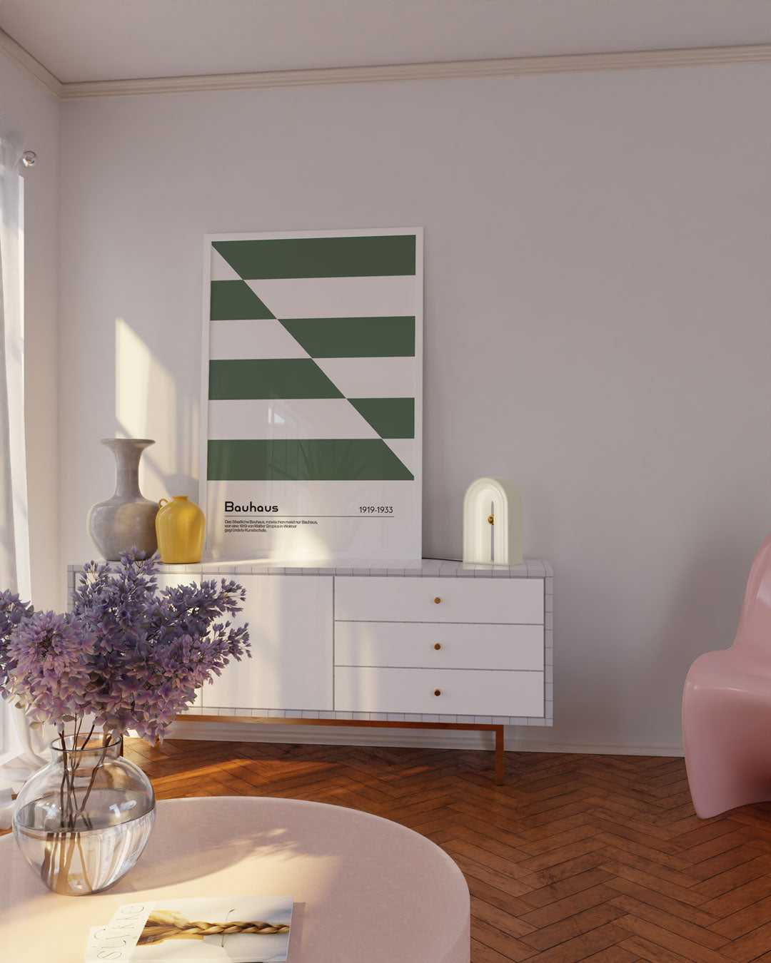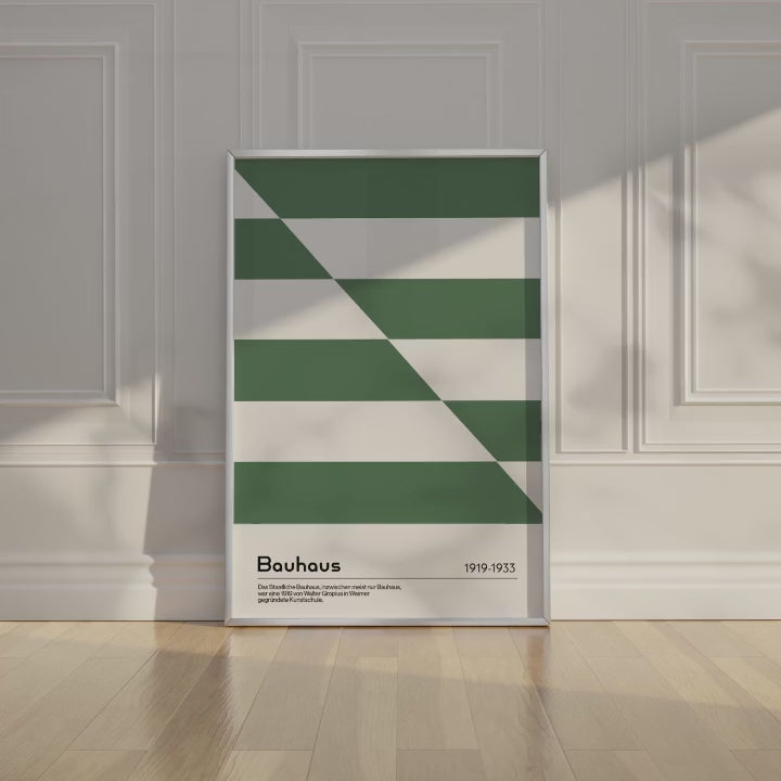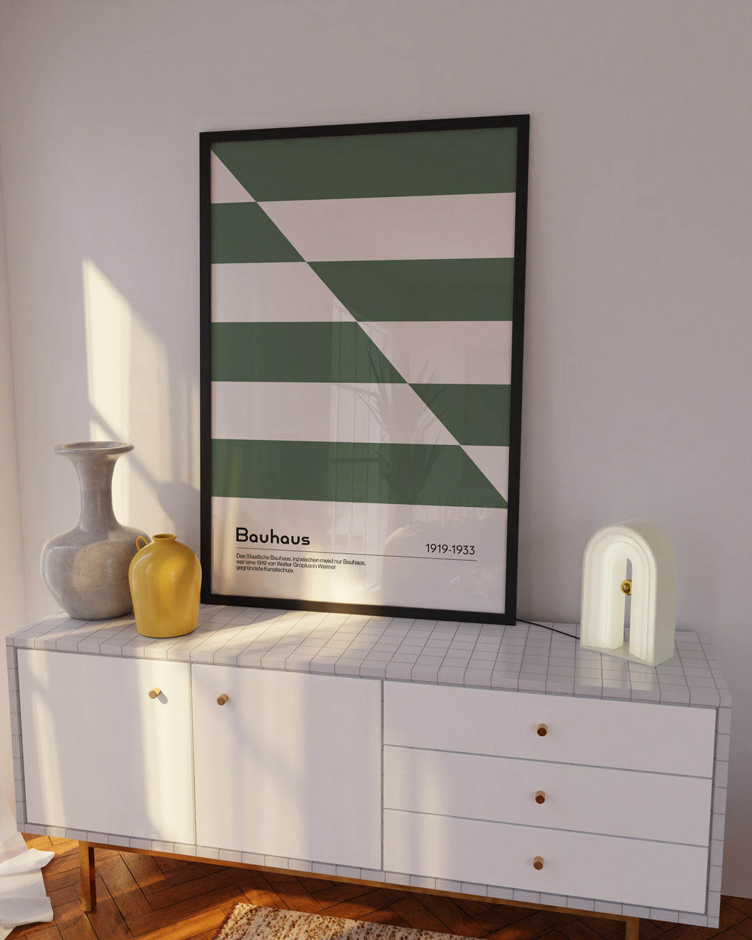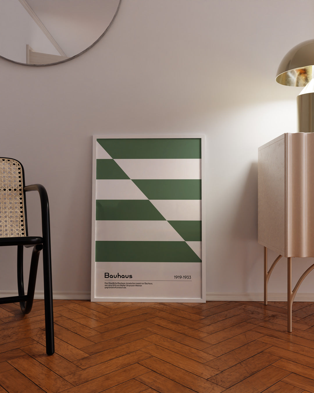 落ち着いたグリーンとホワイトのストライプが織りなす、静かで洗練された構成。対角に走るシャープなラインが空間に緊張感をもたらしつつも、色調がやさしいためナチュラルなインテリアにも自然に溶け込みます。