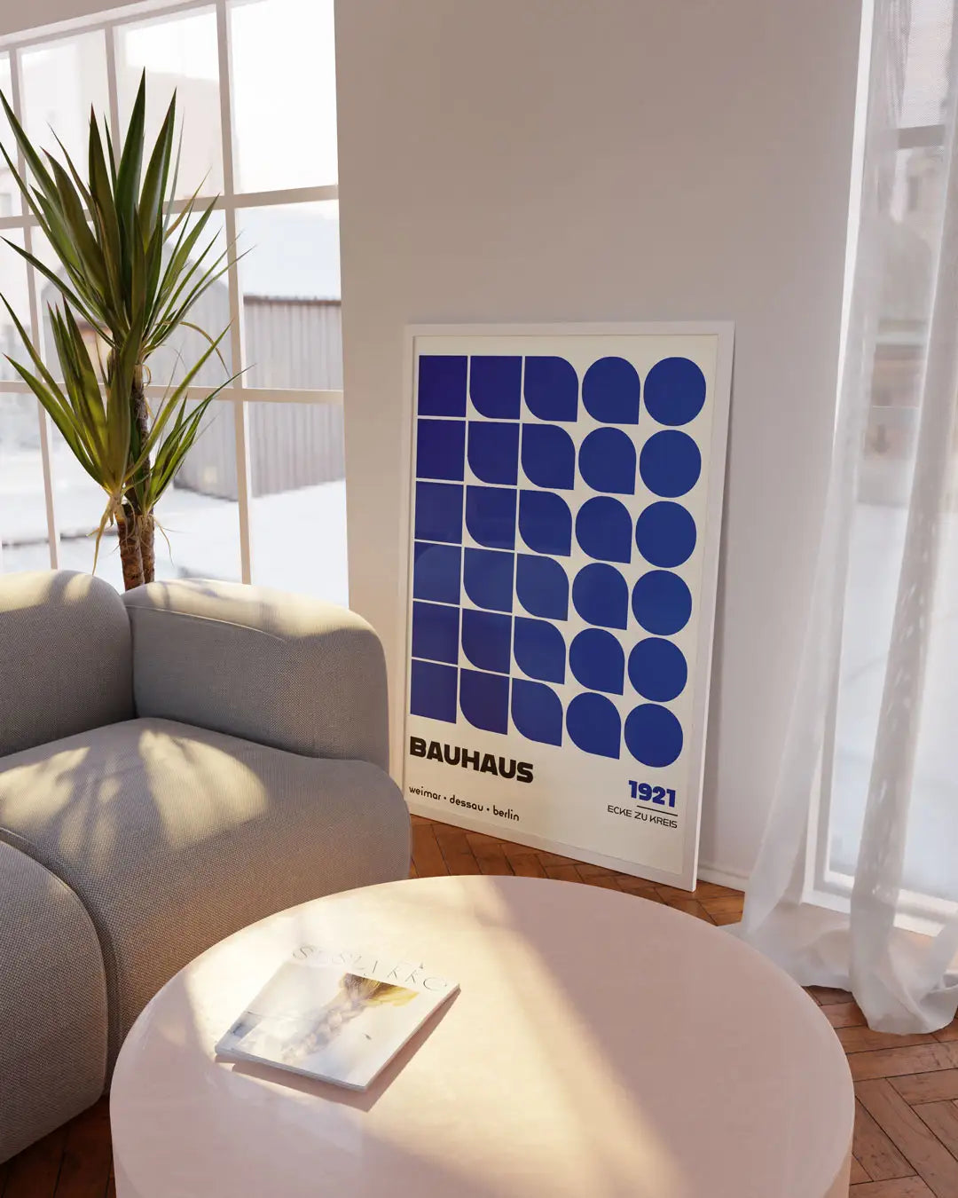 バウハウス運動の幾何学的なデザイン哲学を象徴する作品です。タイトルの「Ecke zu Kreis(角から円へ)」が示すように、四角形から円へと変化するパターンが規則的に並べられ、モダニズムのシンプルさとリズム感を表現しています。