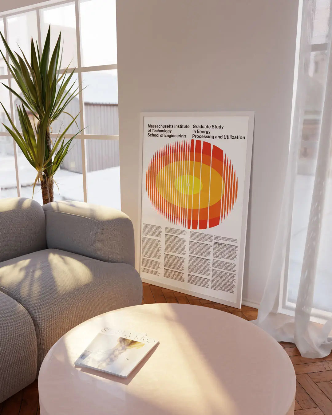 重なり合う円形と、大胆に配置された「ENERGY」のタイポグラフィが、視覚的なリズムを生み出しています。暖色系のグラデーションは、見る人にポジティブな印象を与え、リビングやワークスペースを明るく彩ります。