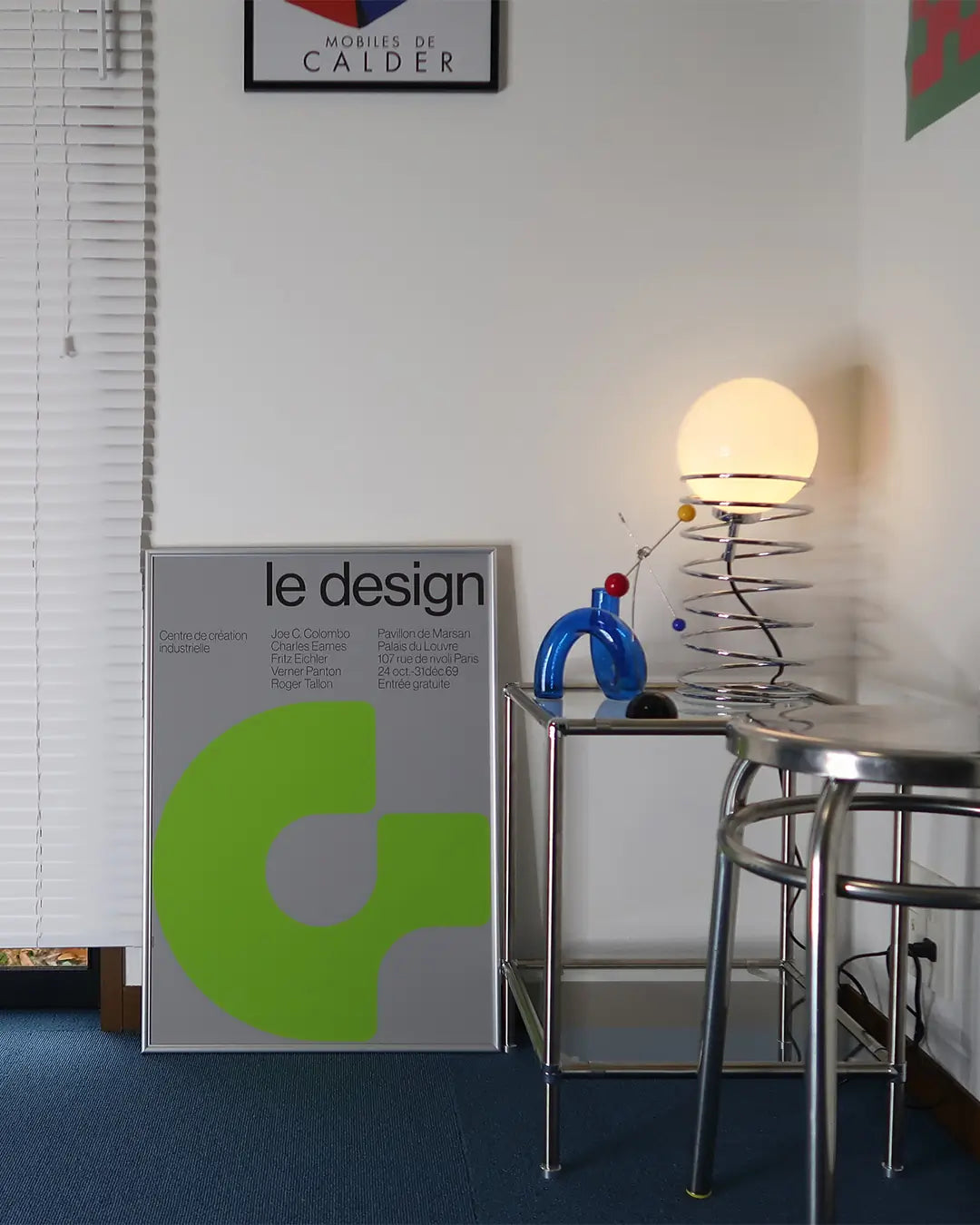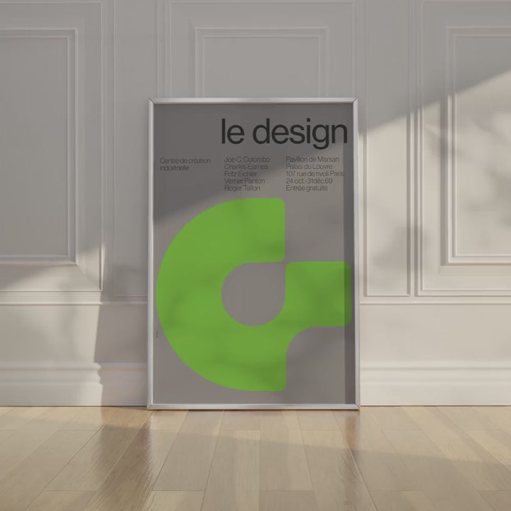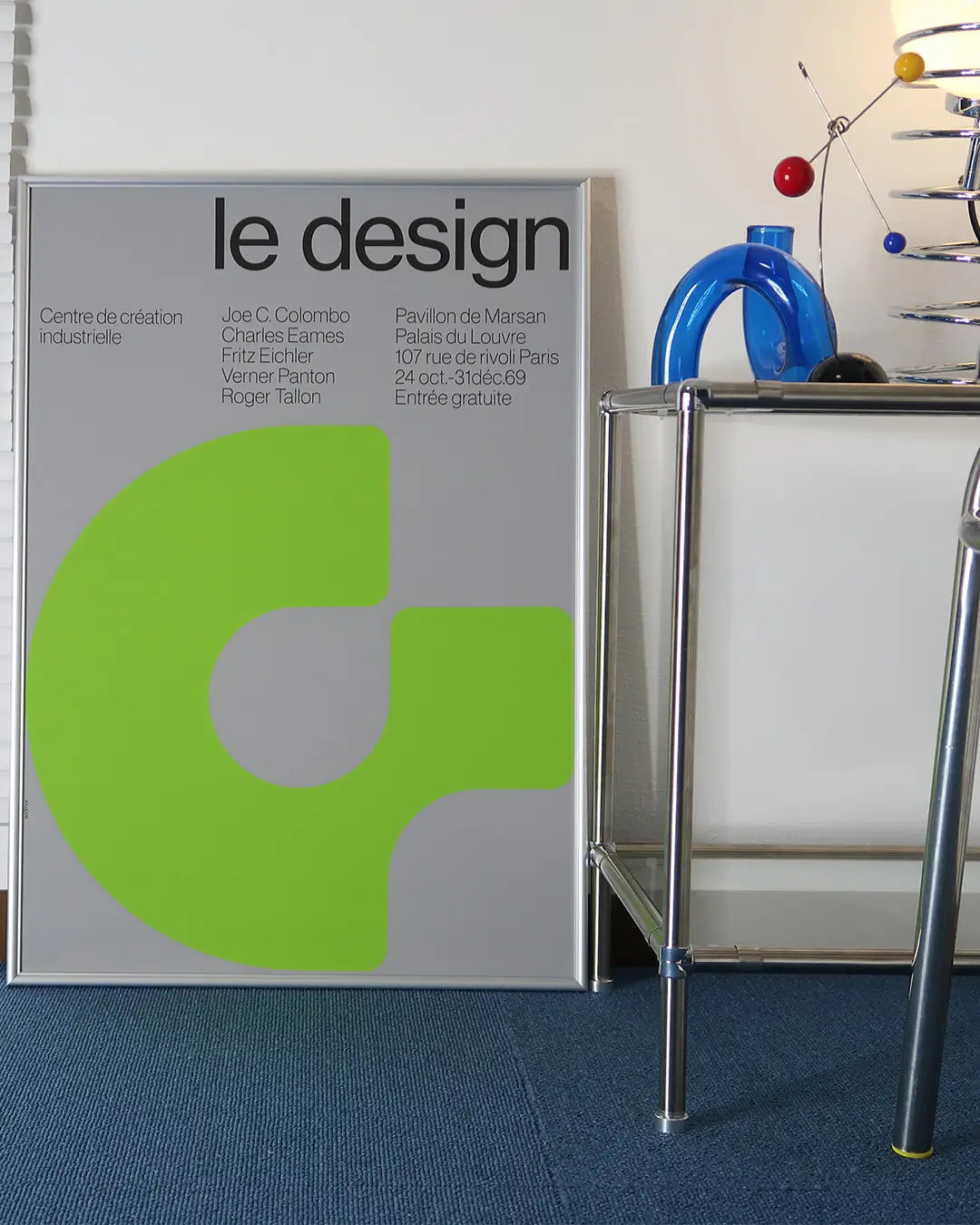 1969年の秋、フランス、パリに位置する、ジョルジュ・ポンピドゥー国立芸術文化センターにて、イタリアの有名なデザイナー、ジョエ・コロンボを筆頭に5人の著名なインダストリアルデザイナーが集結し、エキシビジョン«Quest-ce que le design ? »が開催されました。その当時の広告としてデザインされたものをそのままポスターにして額装しています。