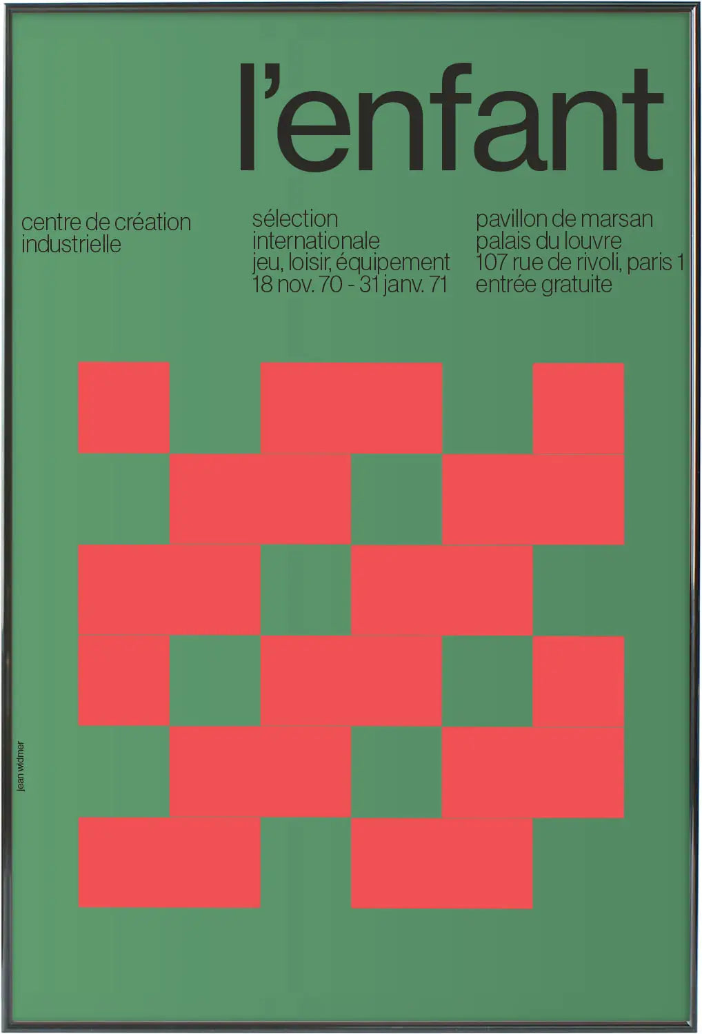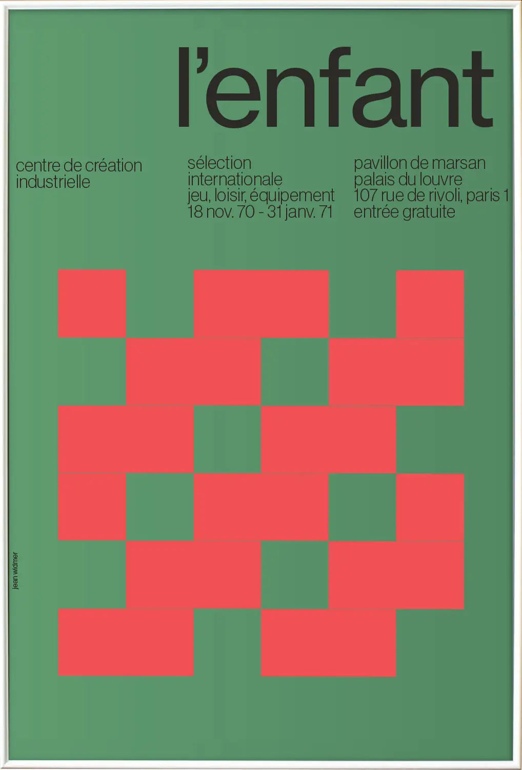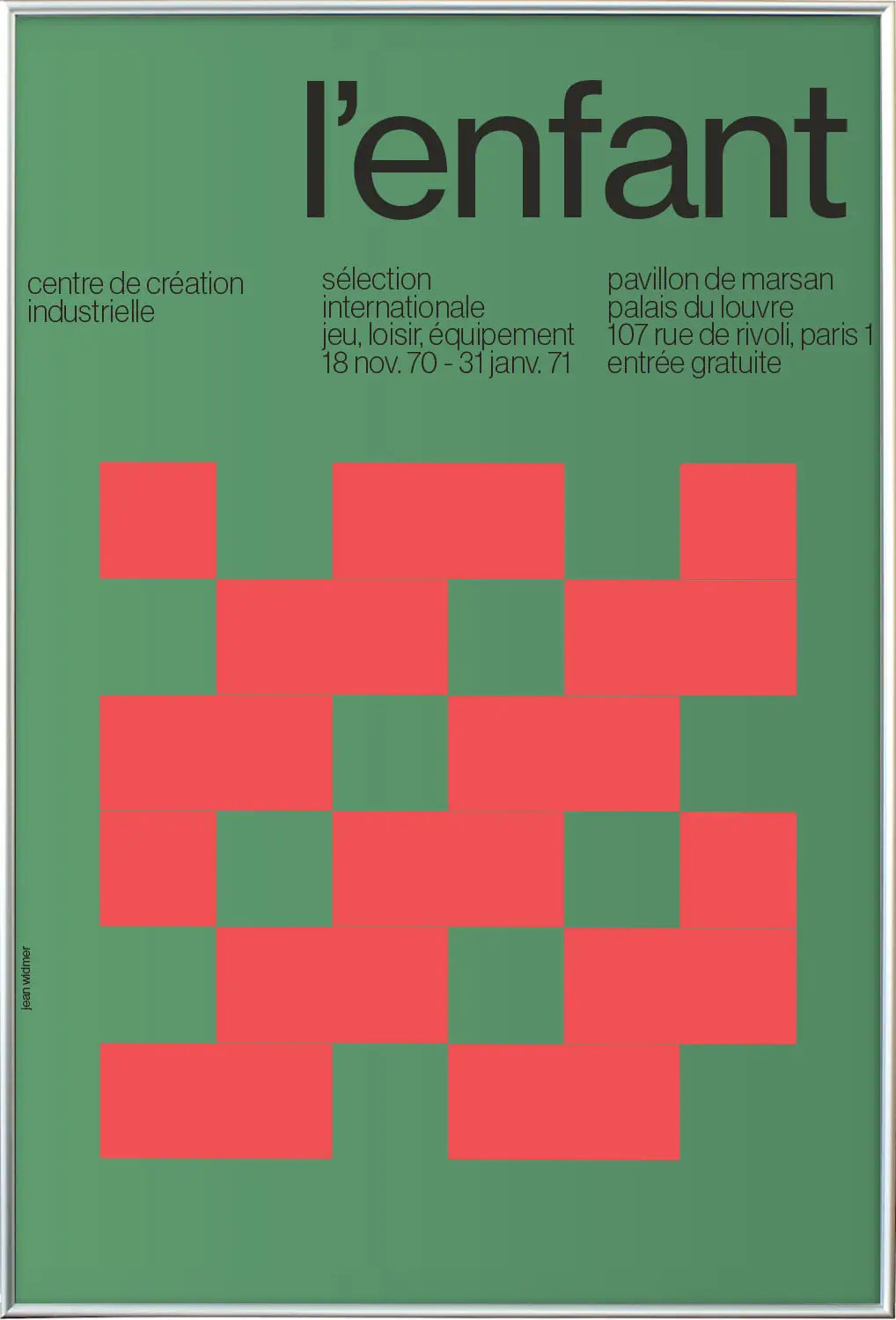 1970年の秋から冬にかけてフランス、パリに位置するジョルジュ・ポンピドゥー国立芸術文化センターにて、世界各国のデザイナーによって手掛けられた、幼児用レジャーフェア«l'enfant Sélection internationale»が開催されました。当時の広告をそのままポスターにして額装しています。