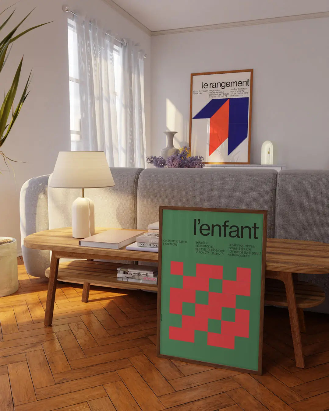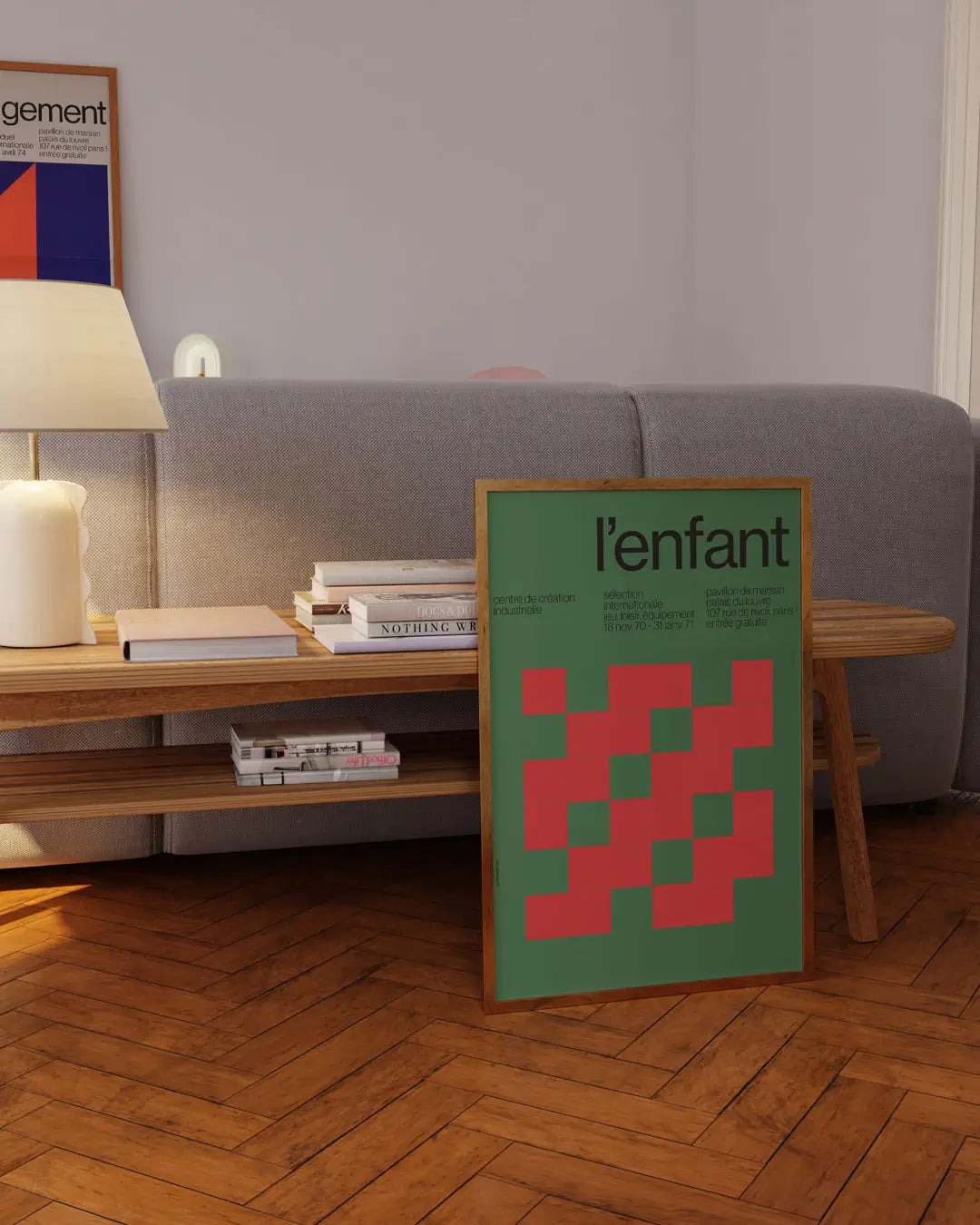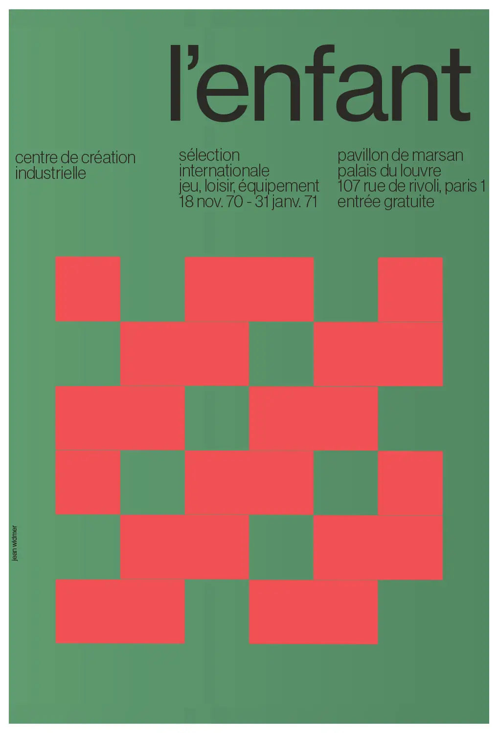 1970年の秋から冬にかけてフランス、パリに位置するジョルジュ・ポンピドゥー国立芸術文化センターにて、世界各国のデザイナーによって手掛けられた、幼児用レジャーフェア«l'enfant Sélection internationale»が開催されました。当時の広告をそのままポスターにして額装しています。