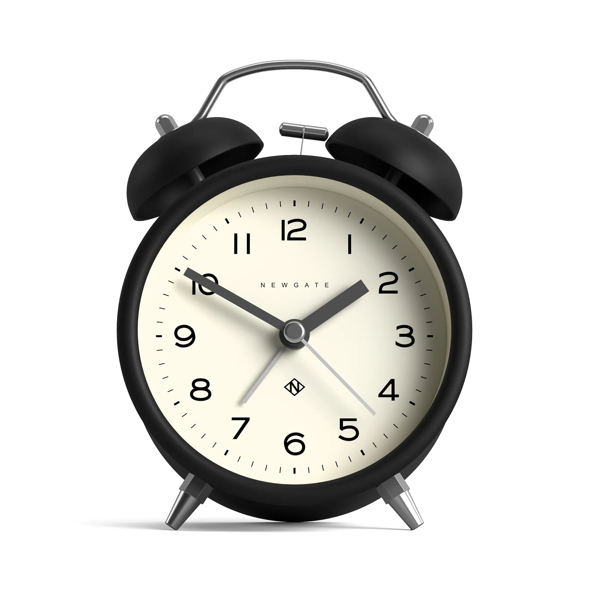 マットブラックの仕上げに、グラフィックな文字盤を組み合わせたモダンなアラームクロック。