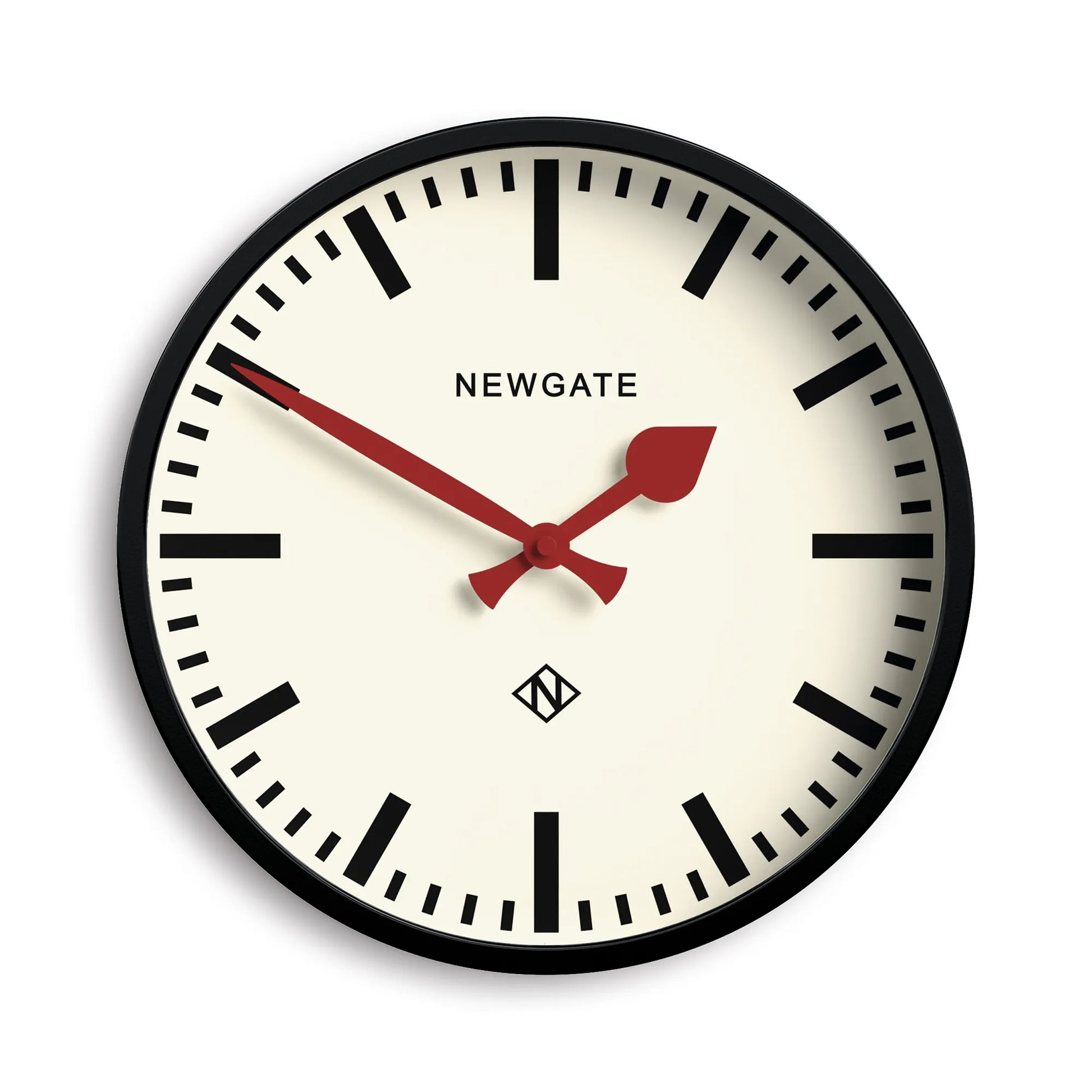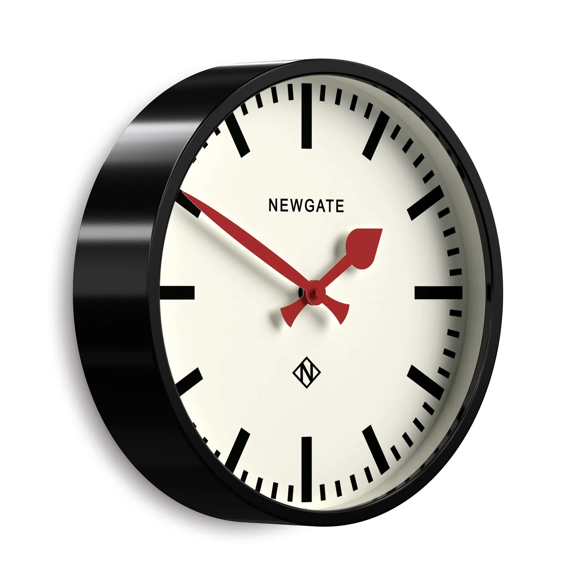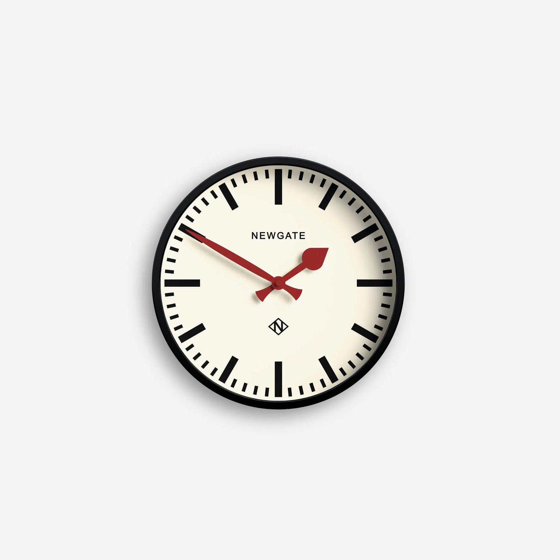 深いマットブラックのメタルケースに、存在感のあるマーカーダイヤルとコントラスト際立つレッドの針を組み合わせた、コンパクトサイズのブラックステーションウォールクロック。直線的にカットされたケースが、よりシャープで現代的な印象をつくります。