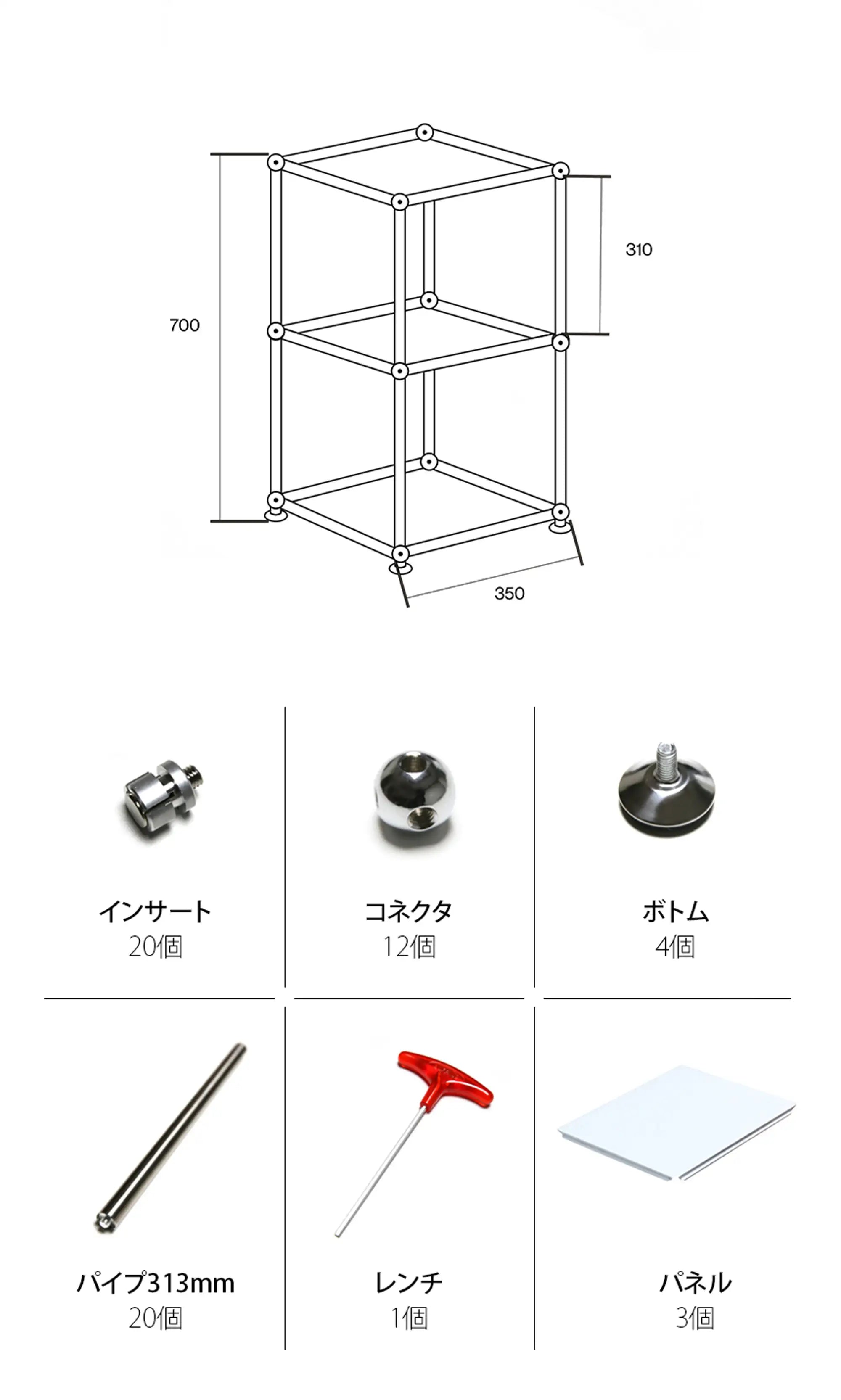 パネル、コネクタ、インサート、専用レンチが一式セットになっており、届いてすぐに組み立てが可能です。