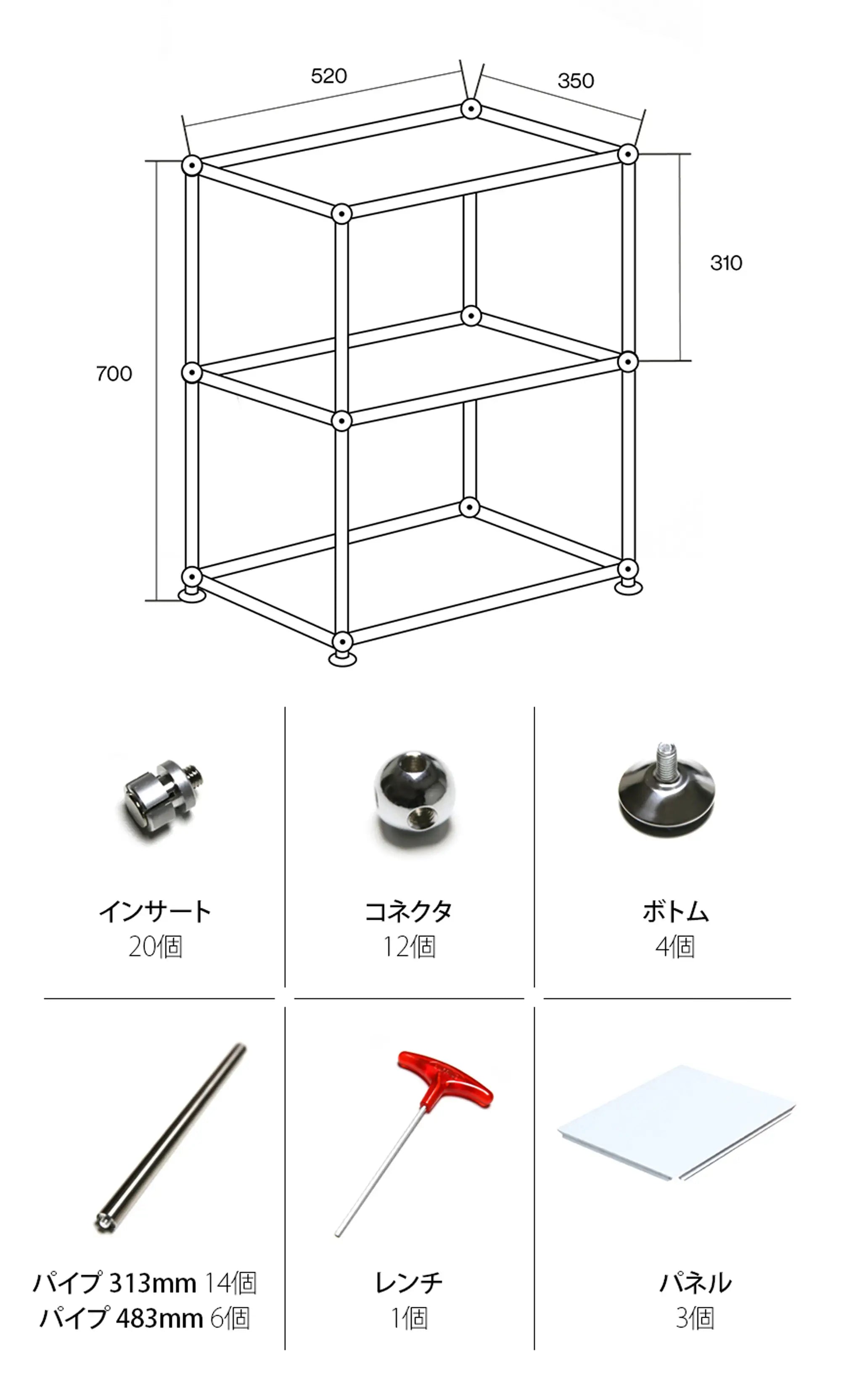 パネル、コネクタ、インサート、専用レンチが一式セットになっており、届いてすぐに組み立てが可能です。