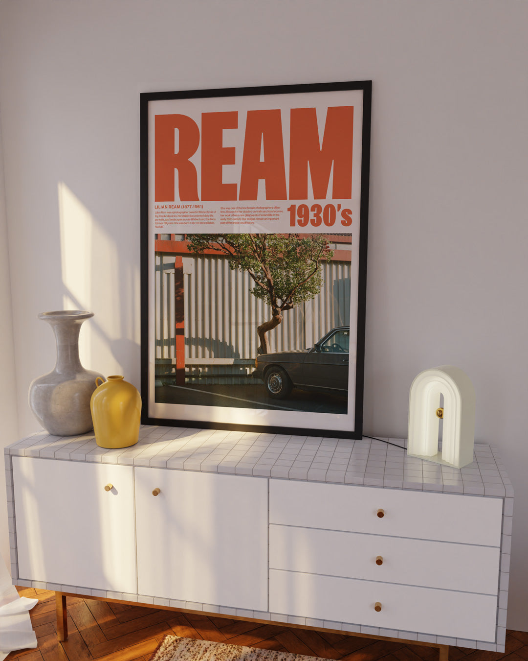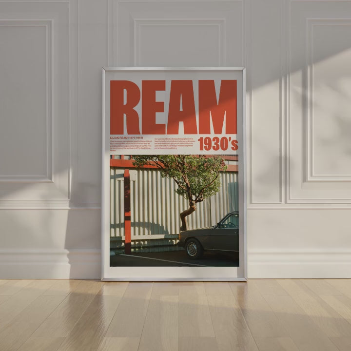 大胆なタイポグラフィとノスタルジックな風景写真が融合したポスター「REAM(1930's)」は、1930年代の視覚文化と現代的な感性をつなぐアート作品です。