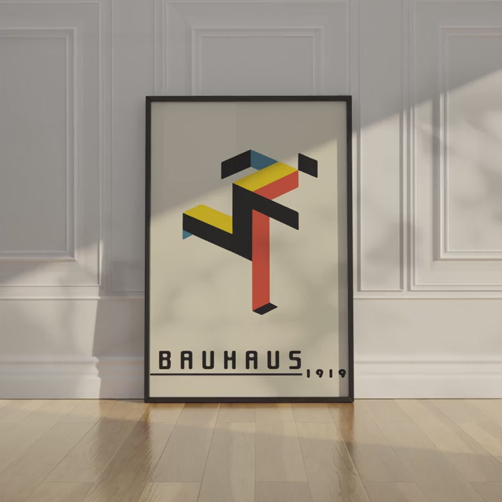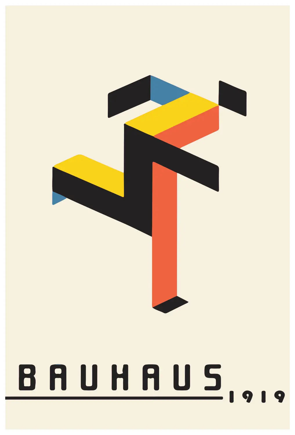 バウハウスの原色である、赤・黄・青で描かれたポスター。クリーム色の背景に黄色い長方形が配され、その中央に平行四辺形で構成された「走る人」のシルエットが躍動的に描かれています。動きとエネルギーを感じさせるデザインです。