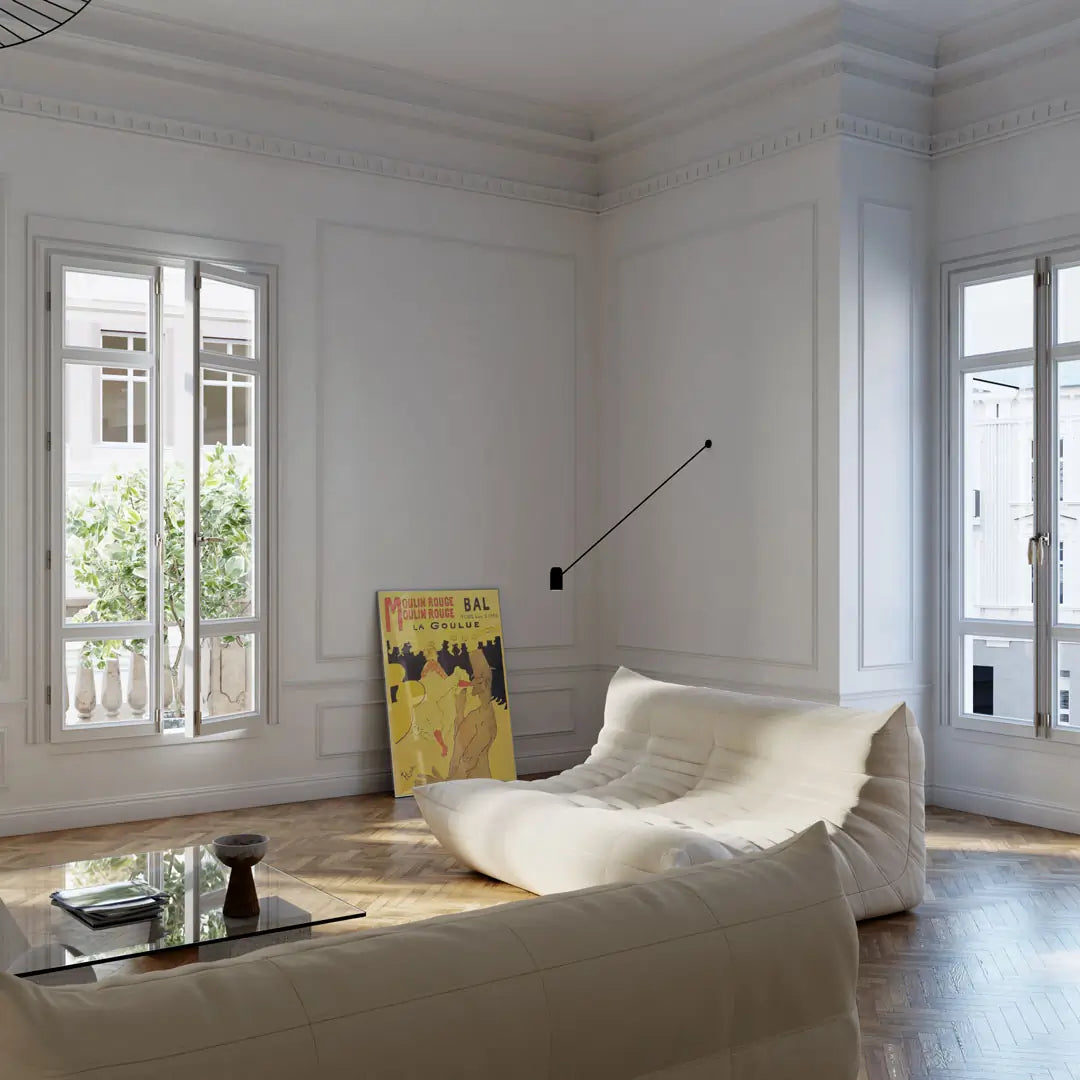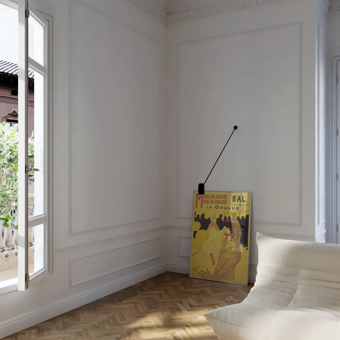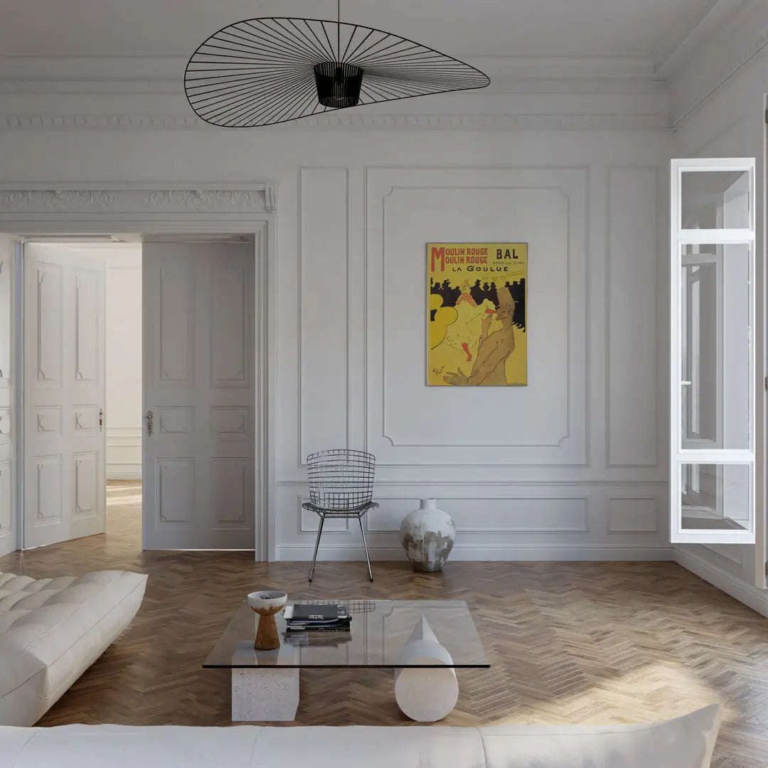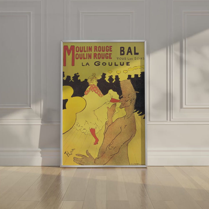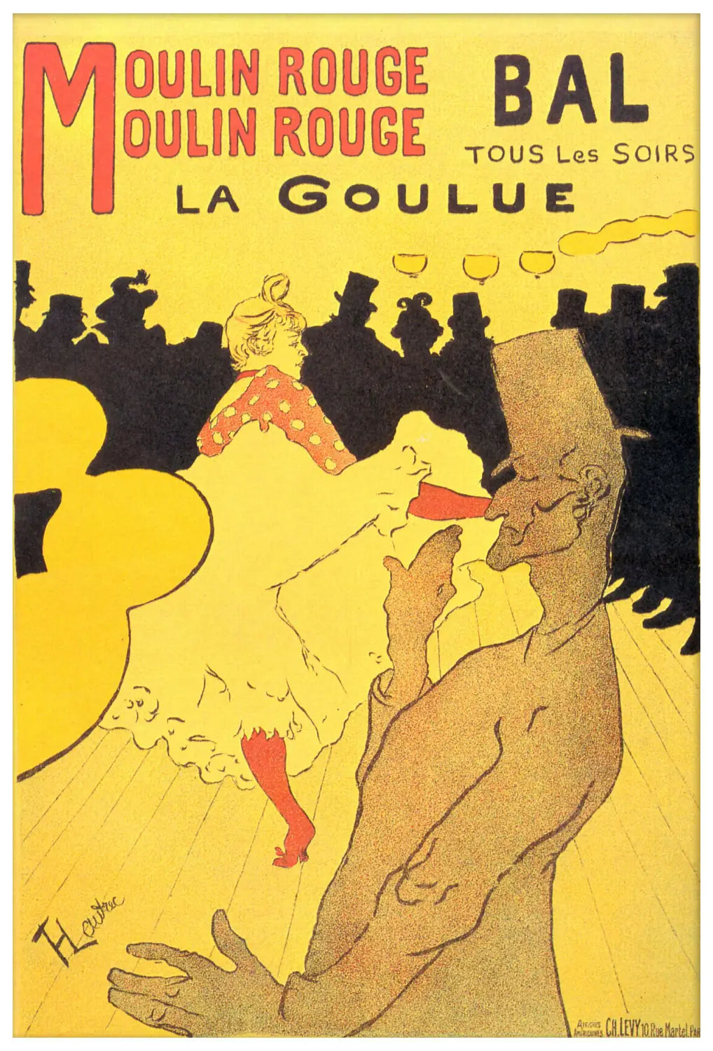 ムーラン・ルージュ ラ・グーリュ」は、フランスの人気クラブ「ムーラン・ルージュ」の宣伝用に制作された、有名なカンカンの踊り手ラ・グーリュとそのしなやかなパートナー、ヴァランタン・ル・デゾッセを描いた大胆な4色刷りのリトグラフである。